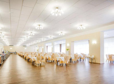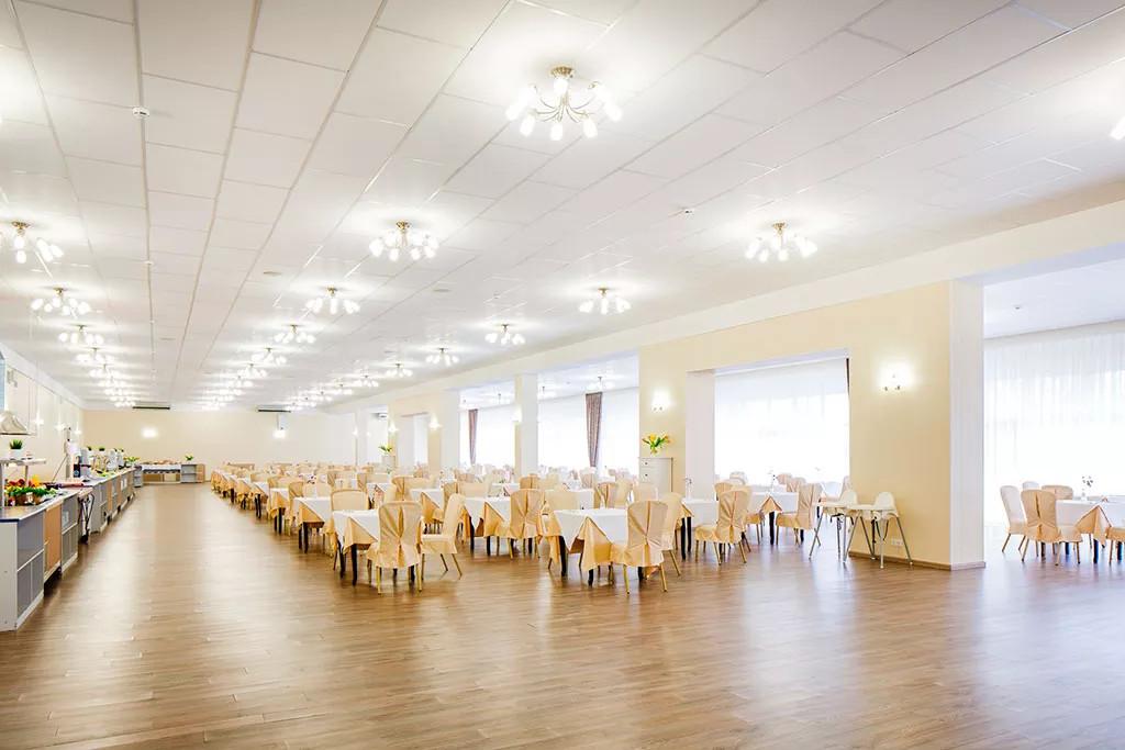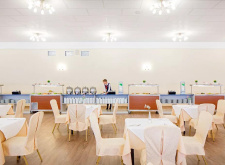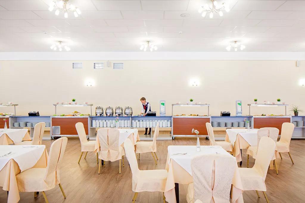В уютном ресторане оборудована детская зона с просмотром мультфильмов. В банкетном зале накрывают столы на завтрак, обед, полдник, ужин и поздний ужин.