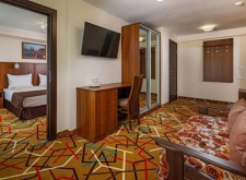 В номере: трюмо, банкетка, вещевой шкаф, сейф, телефон, холодильник, тумбы, рабочая зона, полочка для обуви, кондиционер, стенка, чайник, широкая кровать, диван, вешалка, парфюмерный столик, зеркало, ЖК ТВ, торшер, мини-бар, кресла, софа. Ванная комната с нужной сантехникой, набором элитной косметики и полотенцами.