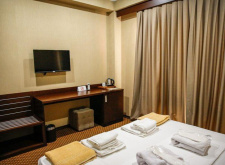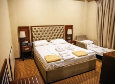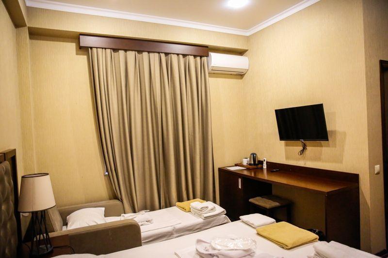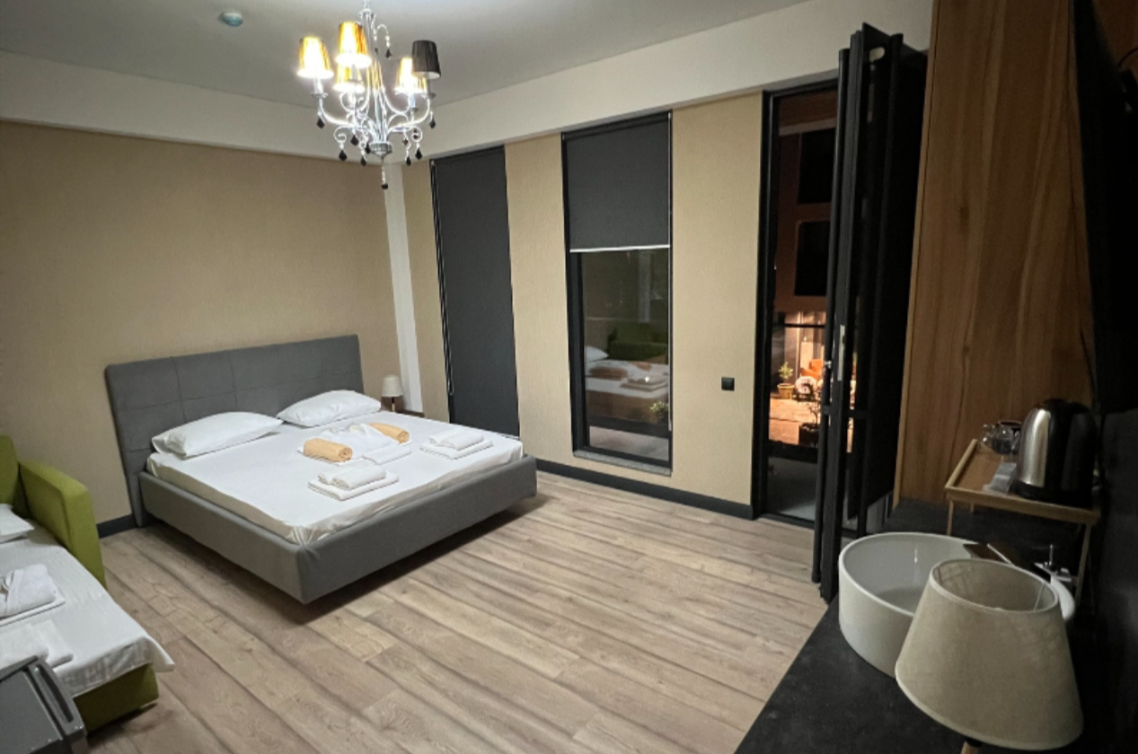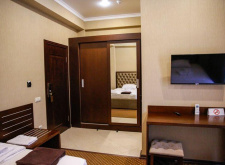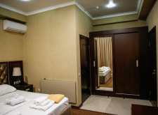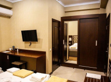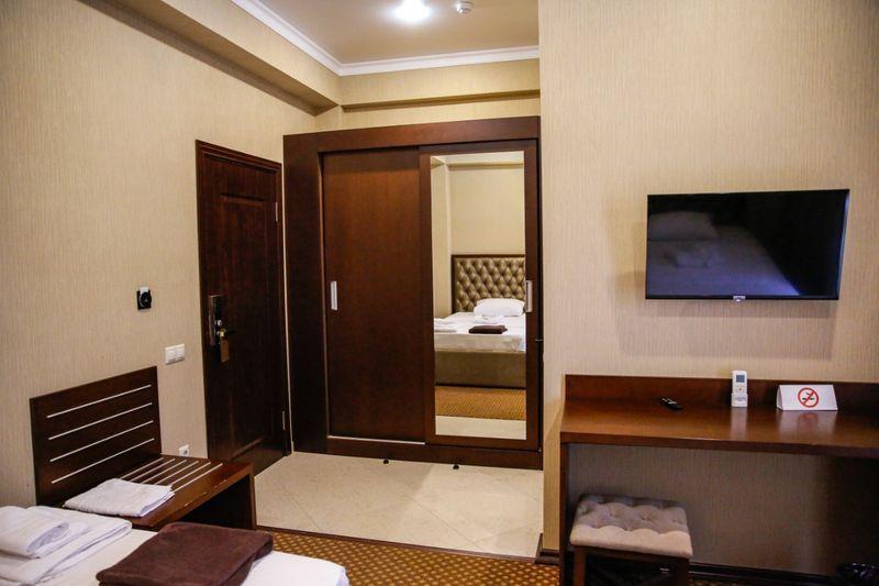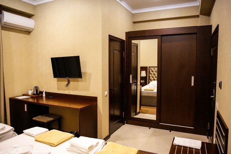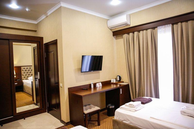 В номере: двуспальная кровать, кресло-кровать, душ, санузел, фен, туалетные- косметические принадлежности, комплект полотенец, ТВ панель, сплит-система, мини-холодильник, чайная станция, телефон, Wi-Fi, сейф, халаты, тапочки, шкаф-гардероб.
