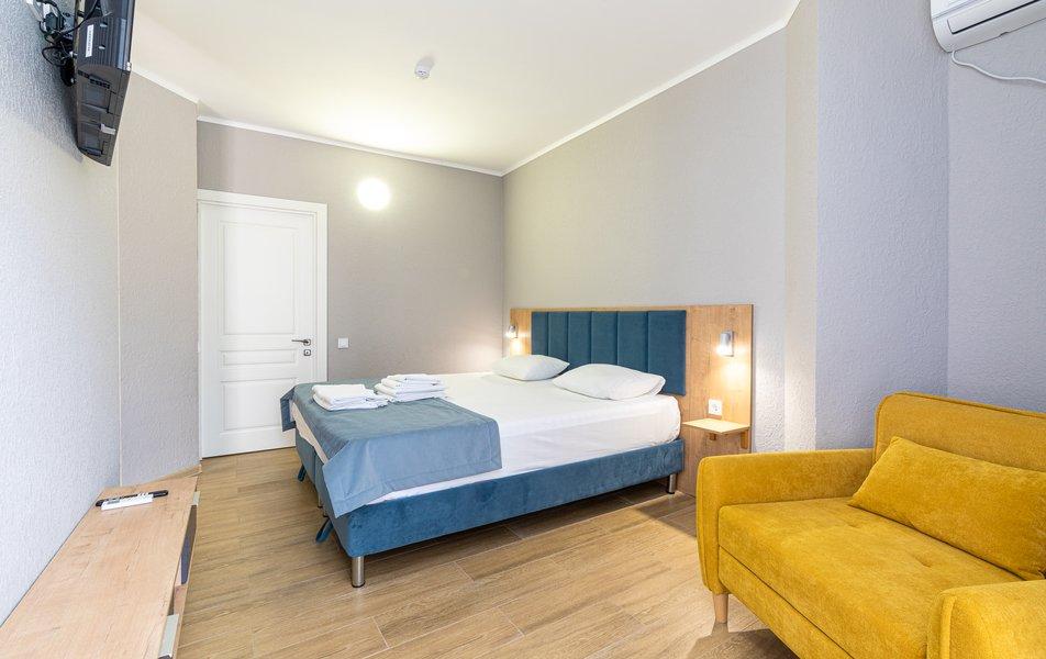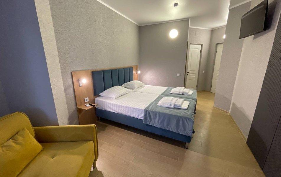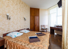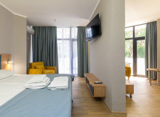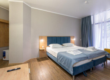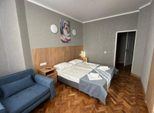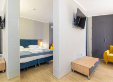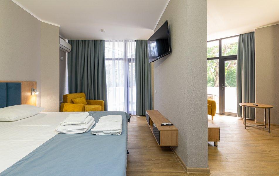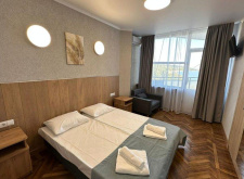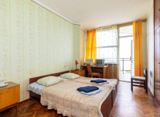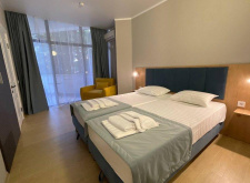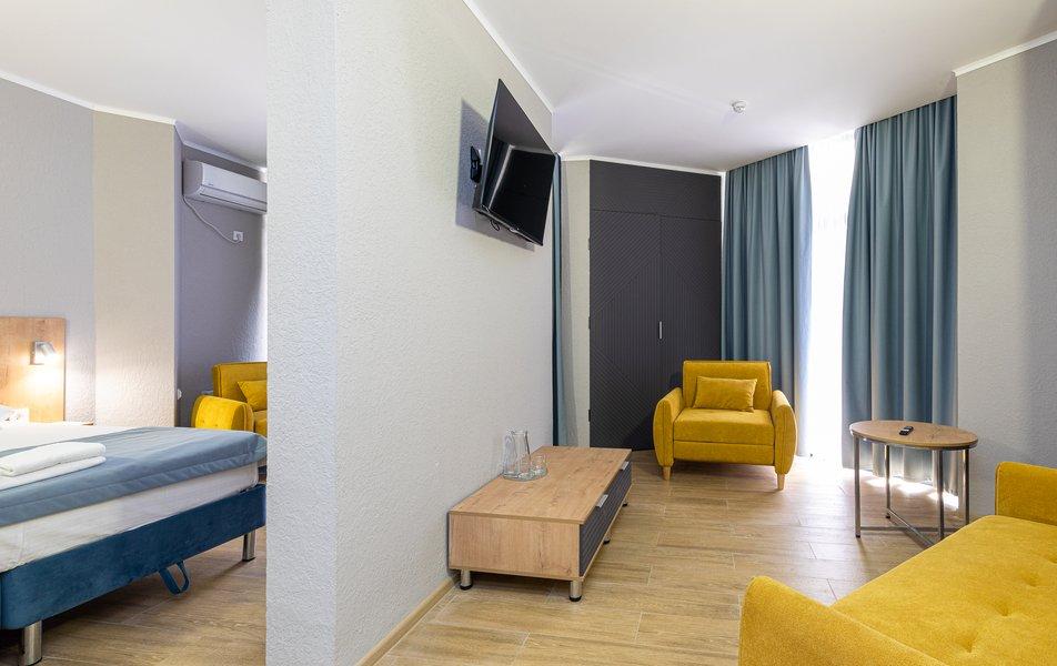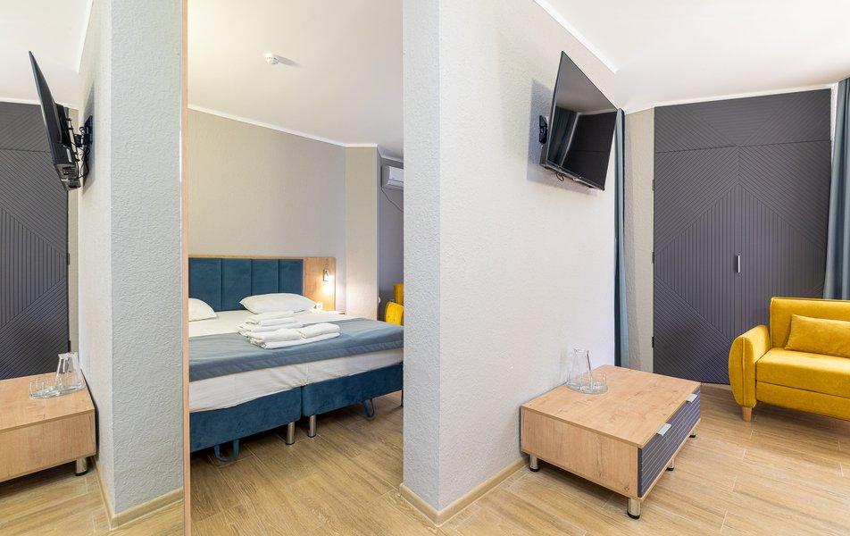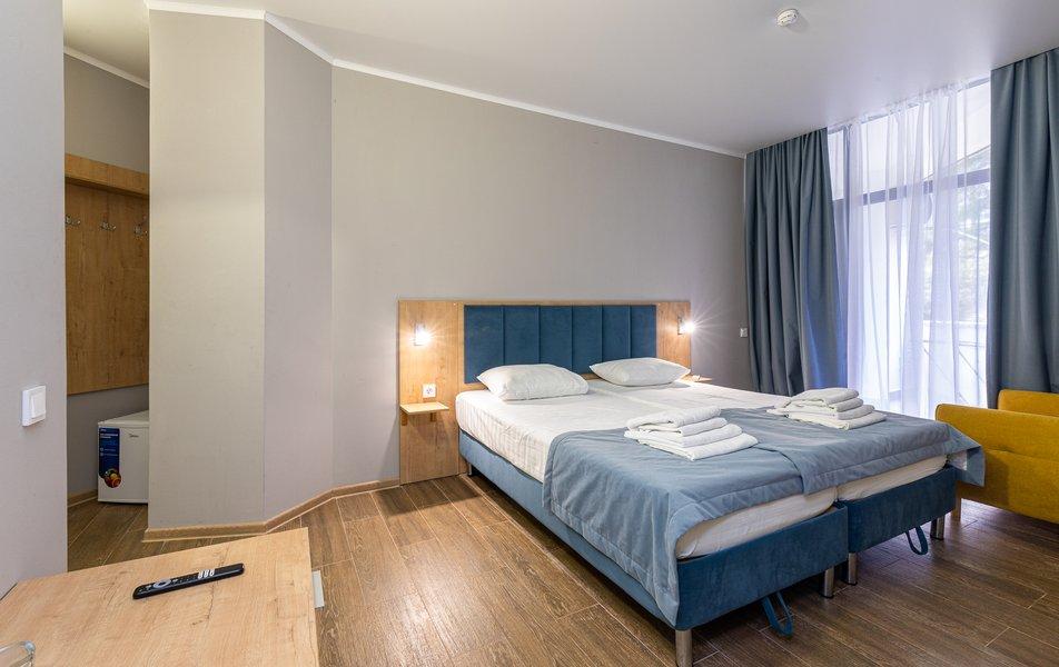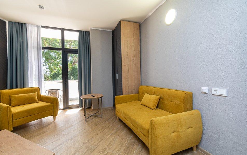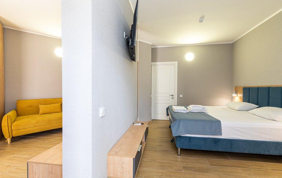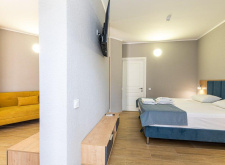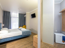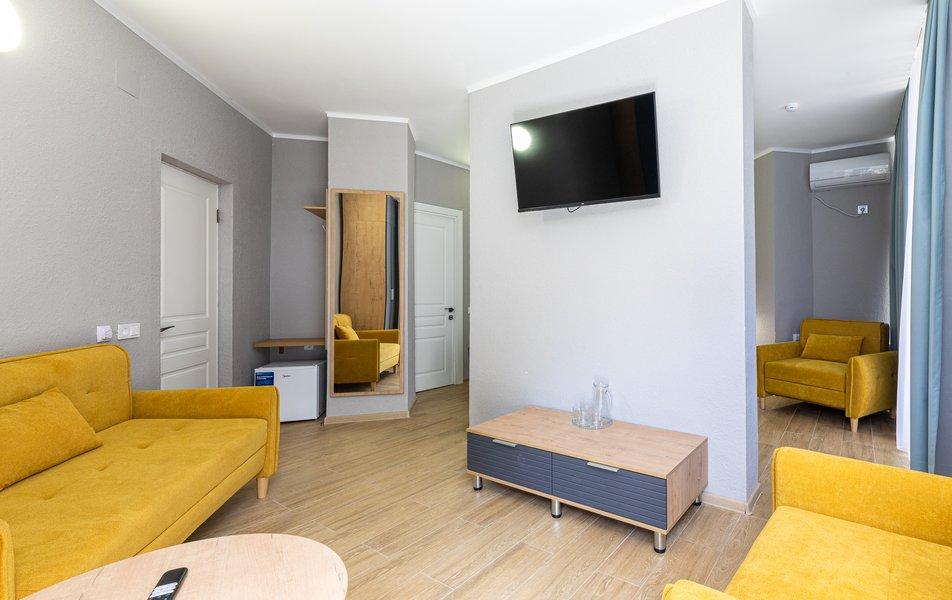 2-местный 2-комнатный евро-люкс (макс. 2+2 чел., 46 кв. м, телевизор, кондиционер, душ, холодильник, балкон, мягкая мебель, 1-спальные/ 2-спальная кровать, туалет, номера после капитального ремонта). Доп. место - диван-кровать, может быть установлен без ограничения по возрасту.