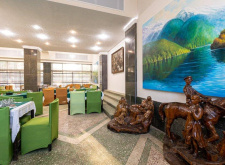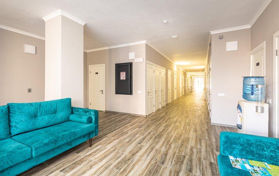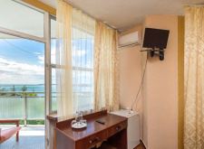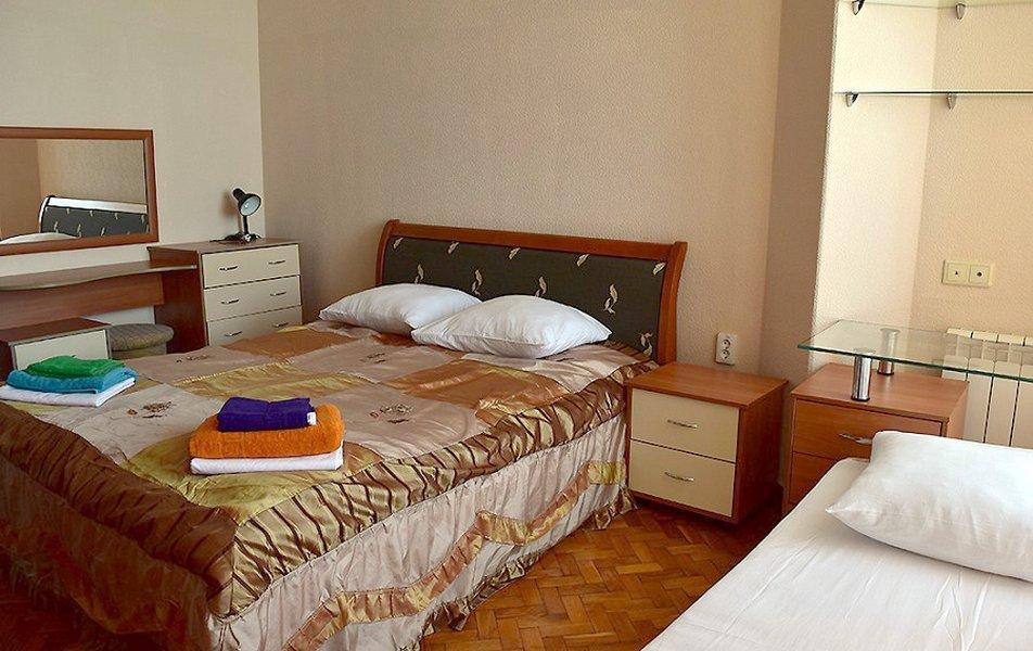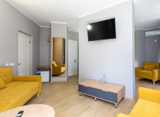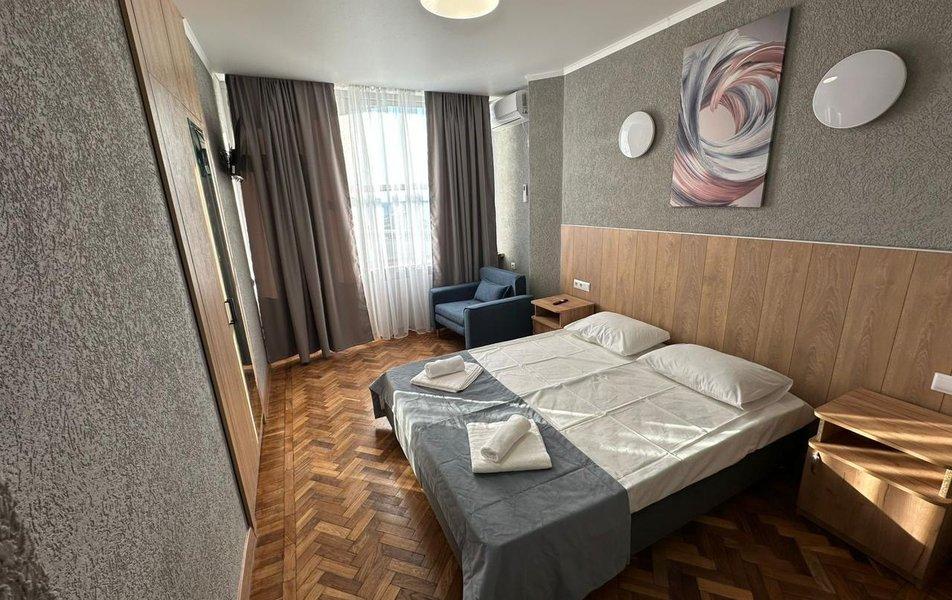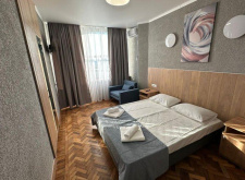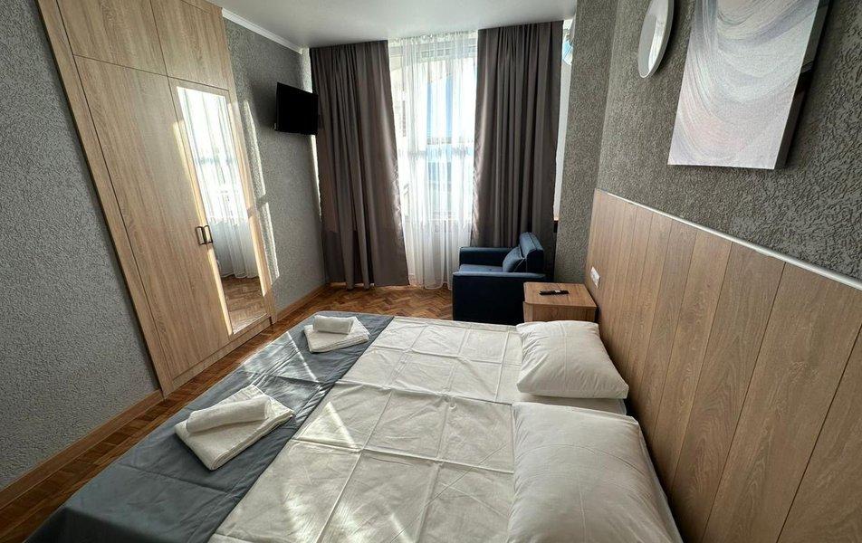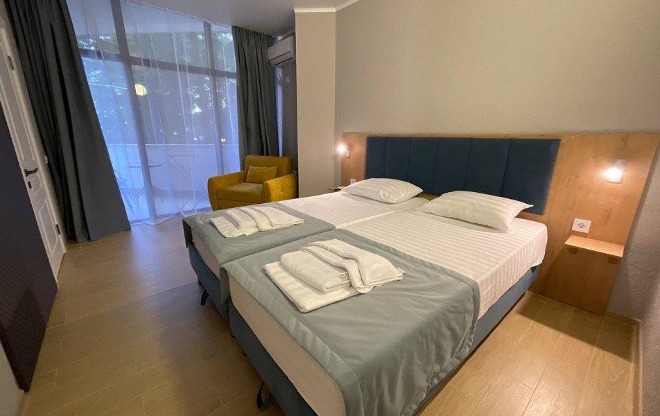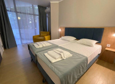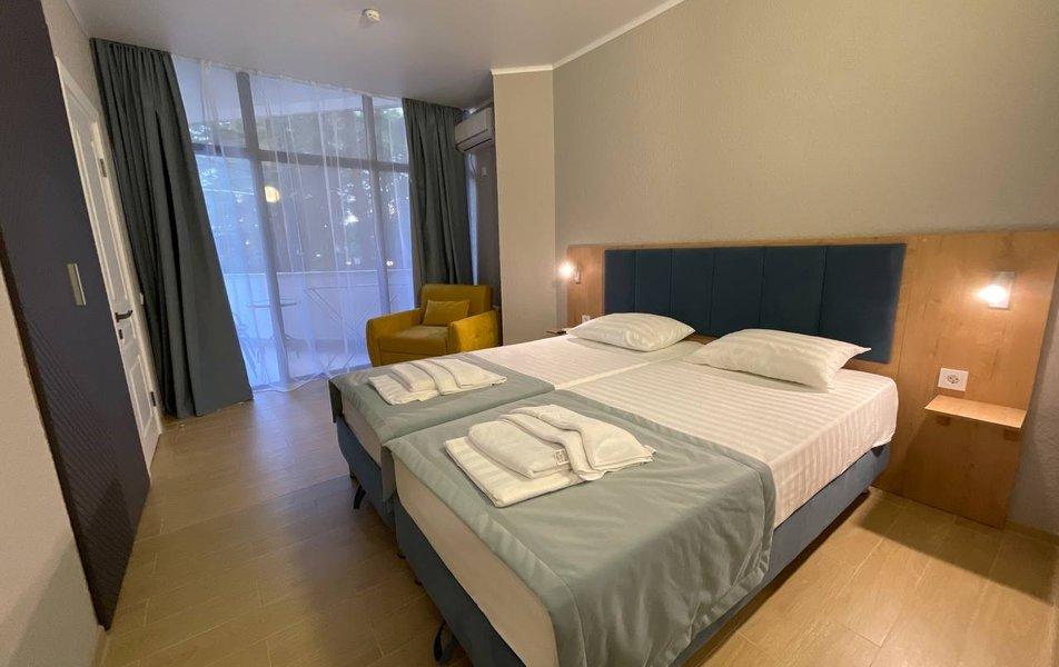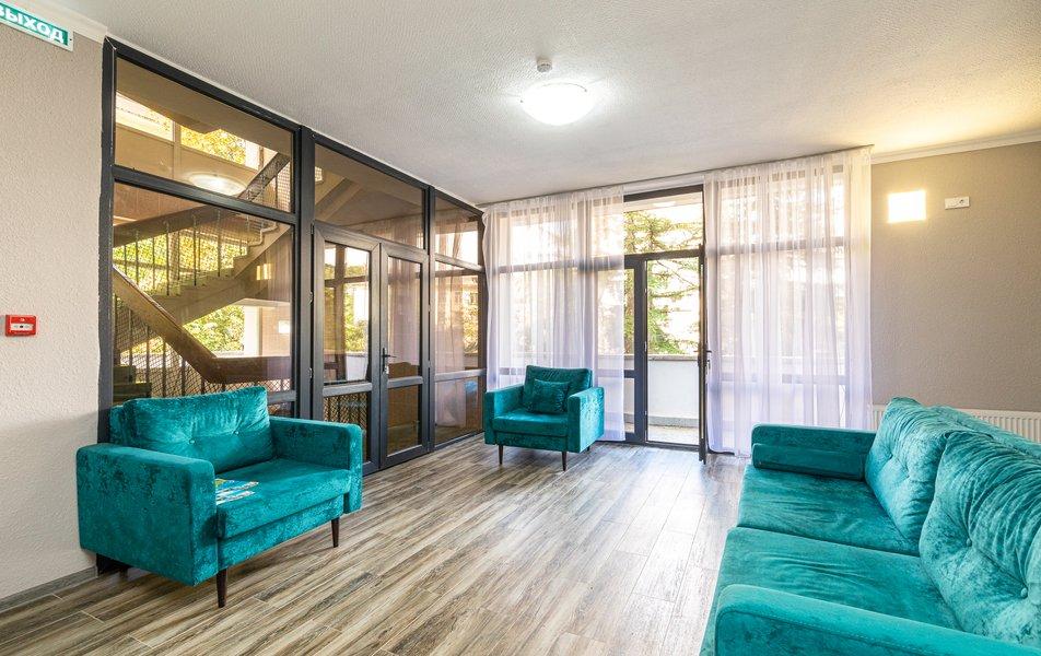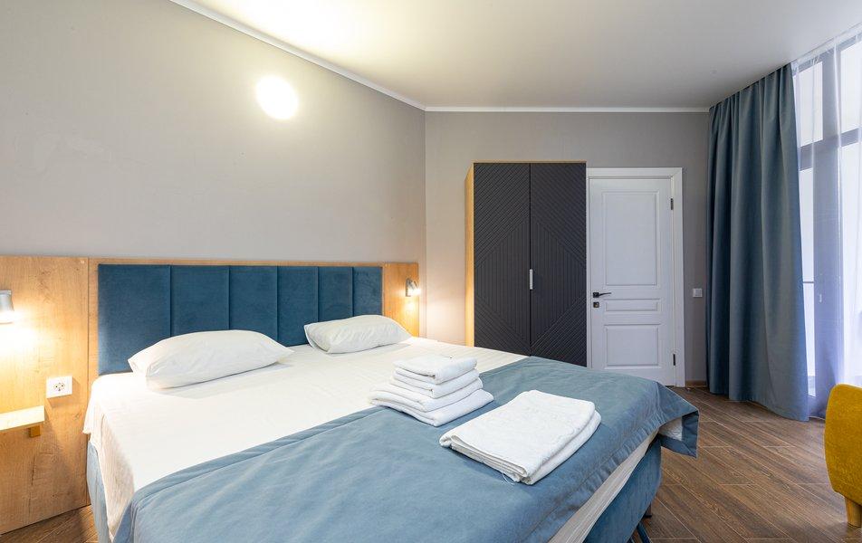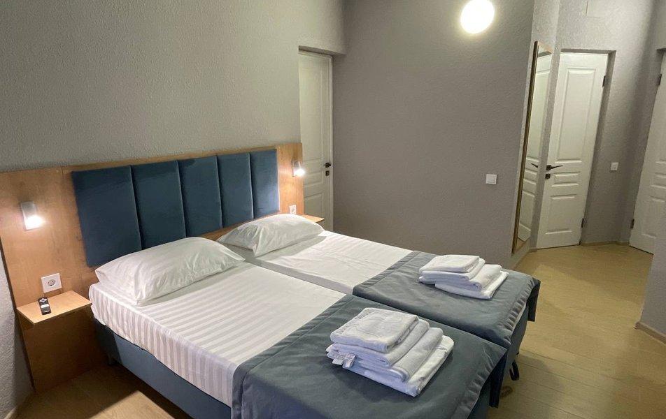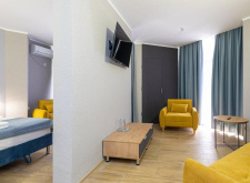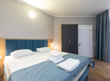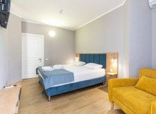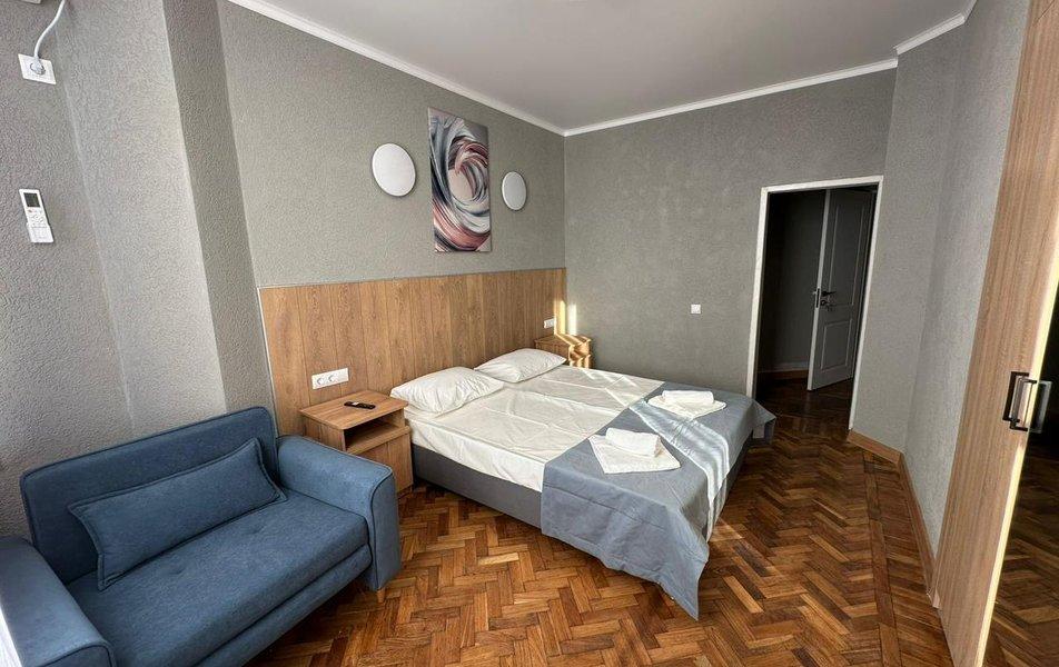 2-местный 2-комнатный евро-люкс (макс. 2+2 чел., 46 кв. м, телевизор, кондиционер, душ, холодильник, балкон, мягкая мебель, 1-спальные/ 2-спальная кровать, туалет, номера после капитального ремонта). Доп. место - диван-кровать, может быть установлен без ограничения по возрасту.