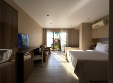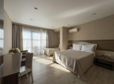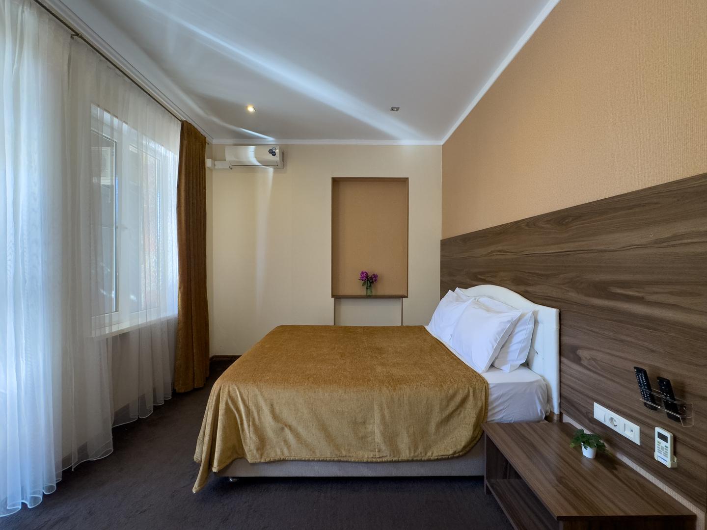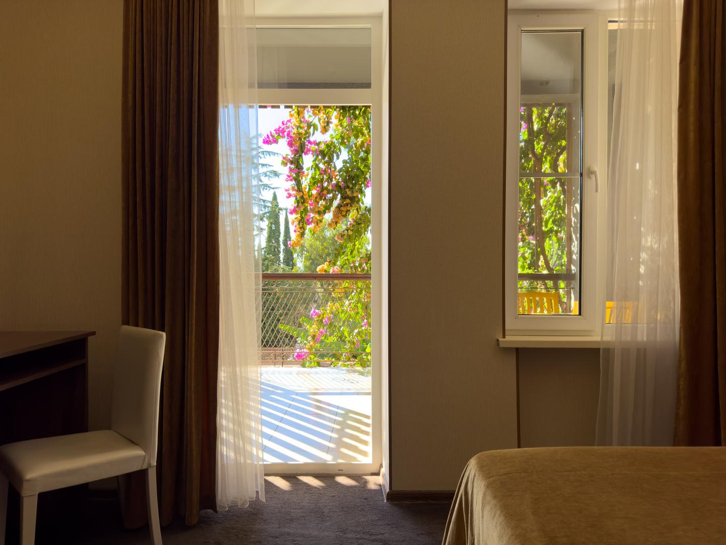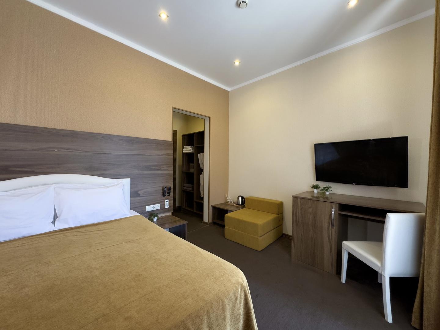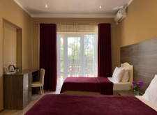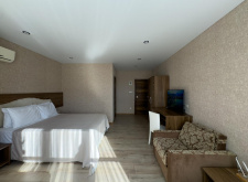 В комплектации номера: кровать двуспальная 160х200 см, прикроватные тумбы, шкаф гардероб, зеркало, сейф, стол, стул, тв, кондиционер, холодильник, чайная станция, меблированный балкон, электрическая и напольная сушилки для белья, ванная комната: умывальник с зеркалом, унитаз, душевая кабина, косметика, фен, набор полотенец, в том числе для пляжа и бассейна в период высокого сезона. Халаты и тапочки в период высокого сезона. Доп место - кресло- кровать для одного гостя. Максимальное размещение – 3 человека.