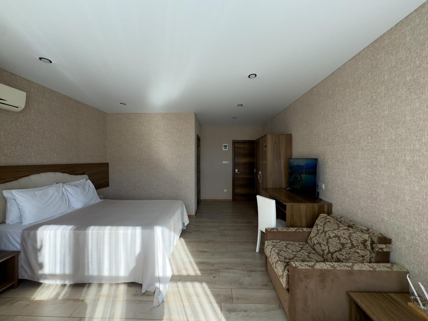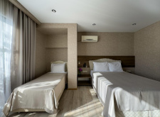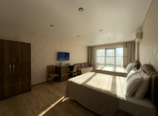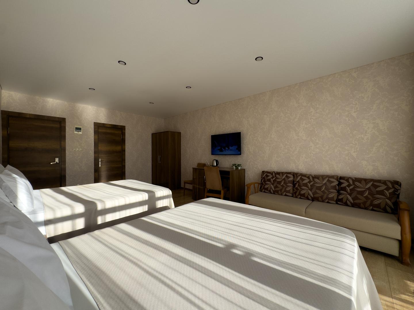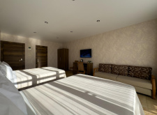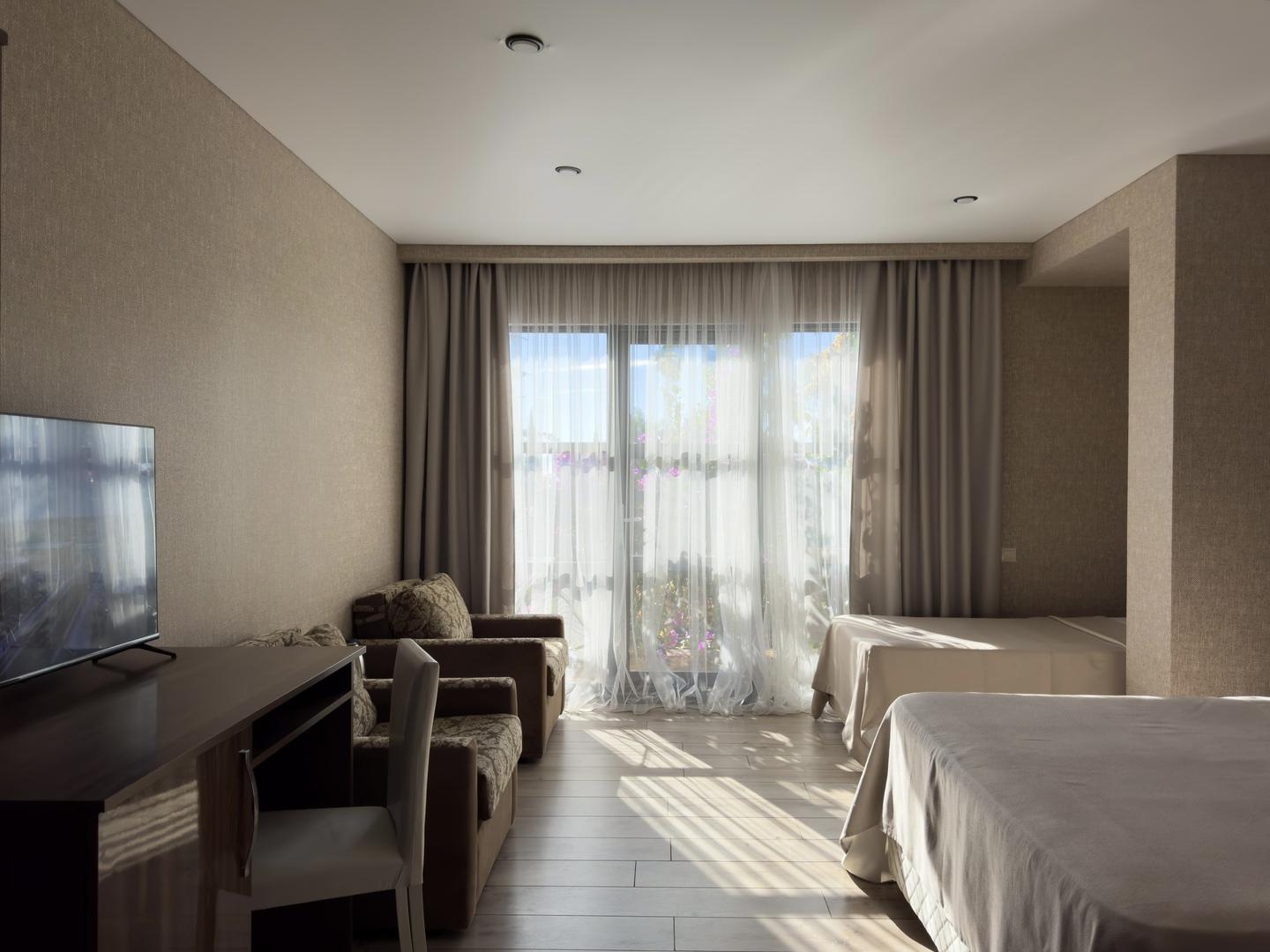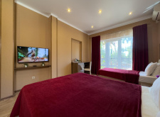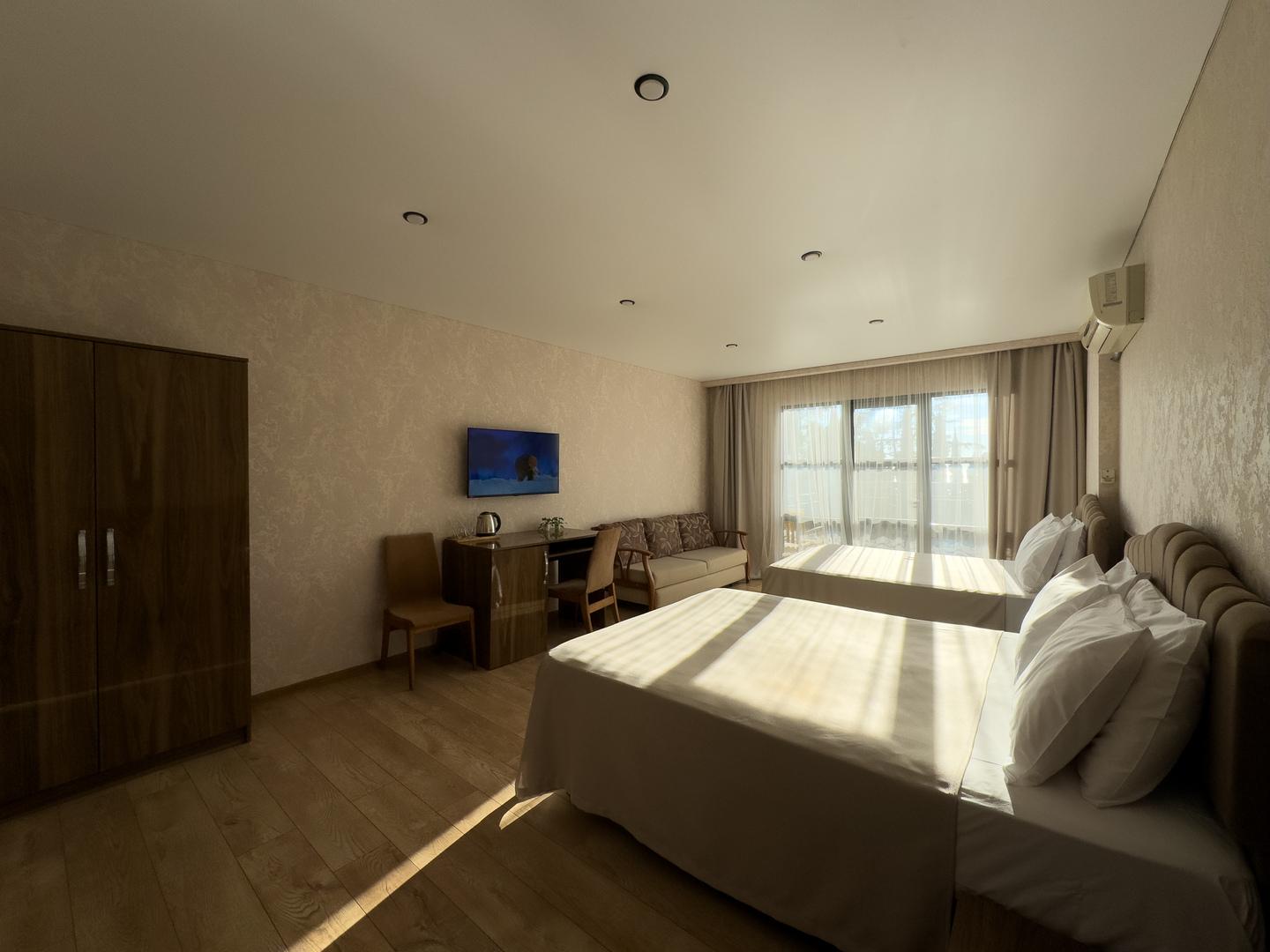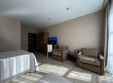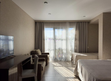 В комплектации номера: кровать двуспальная 160х200 см, односпальная кровать 90х200 см, прикроватные тумбы, шкаф гардероб, зеркало, сейф, стол, стул, тв, кондиционер, холодильник, чайная станция, меблированный балкон, электрическая и напольная сушилки для белья, ванная комната: умывальник с зеркалом, унитаз, душевая кабина, косметика, фен, набор полотенец, в том числе для пляжа и бассейна в период высокого сезона. Халаты и тапочки в период высокого сезона. Доп место - диван-кровать или 2 кресло-кровати для двух гостей под запрос. Максимальное размещение – 5 человек.