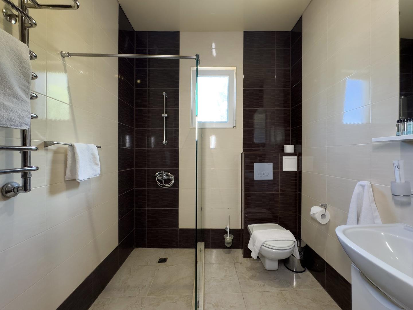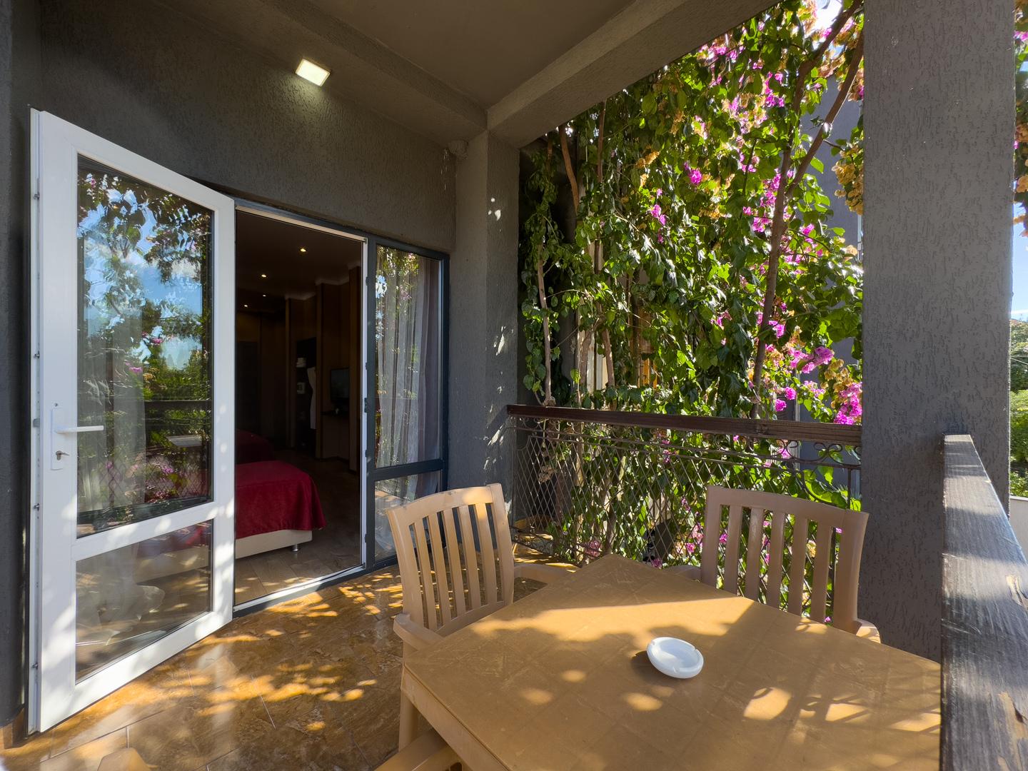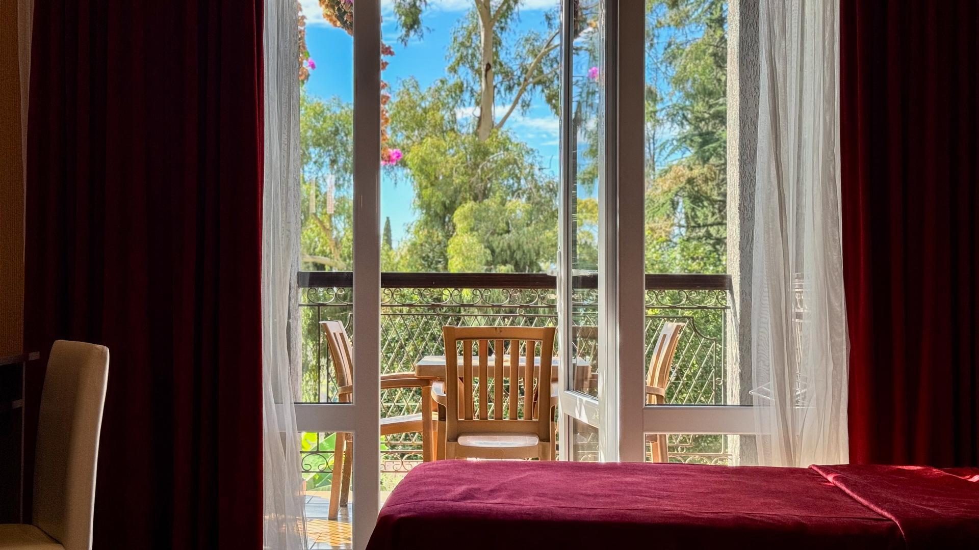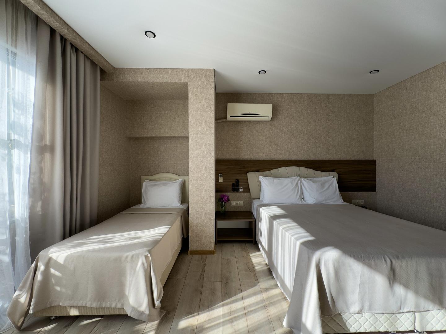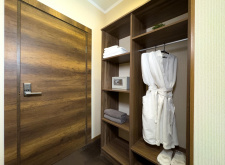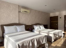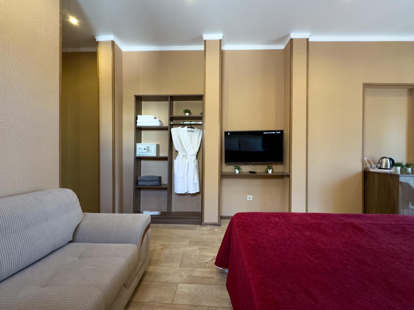 В комплектации номера: кровать двуспальная 160х200 см, односпальная кровать 90х200 см, прикроватные тумбы, шкаф гардероб, зеркало, сейф, стол, стул, тв, кондиционер, холодильник, чайная станция, меблированный балкон, электрическая и напольная сушилки для белья, ванная комната: умывальник с зеркалом, унитаз, душевая кабина, косметика, фен, набор полотенец, в том числе для пляжа и бассейна в период высокого сезона. Халаты и тапочки в период высокого сезона. Доп место - диван-кровать или 2 кресло-кровати для двух гостей под запрос. Максимальное размещение – 5 человек.
