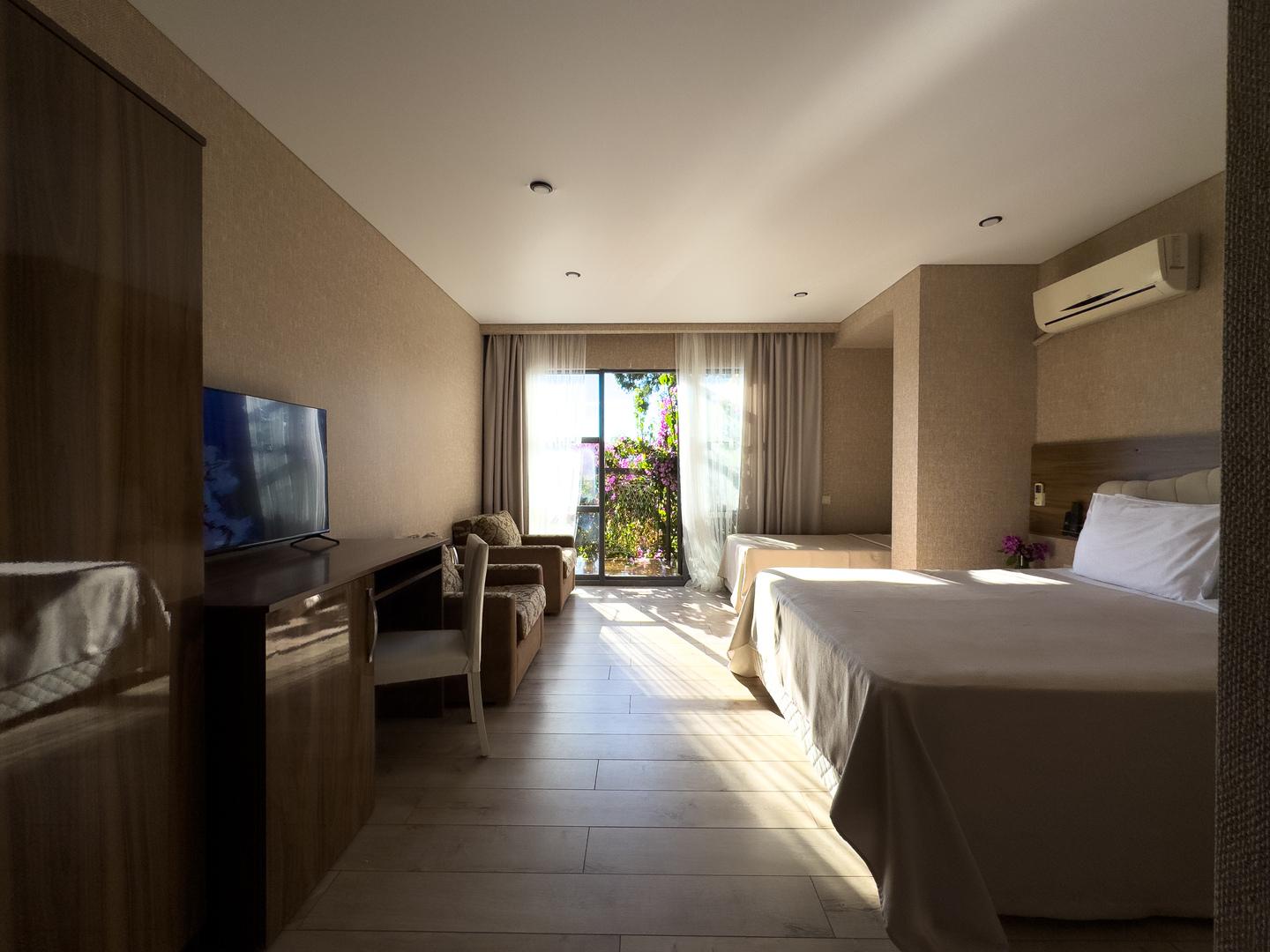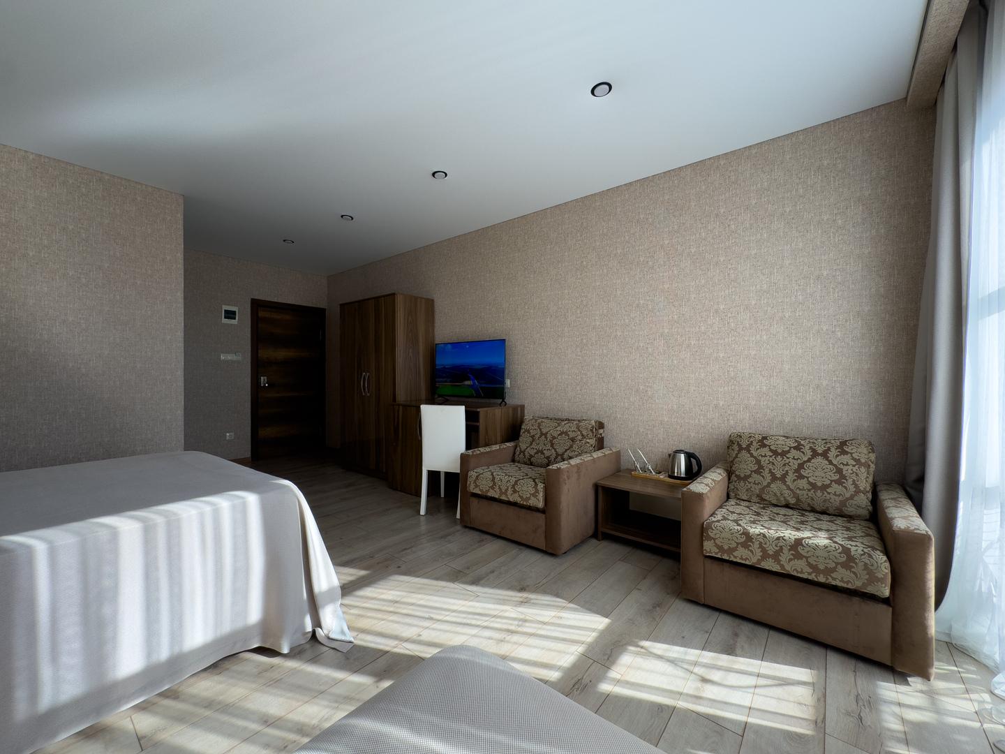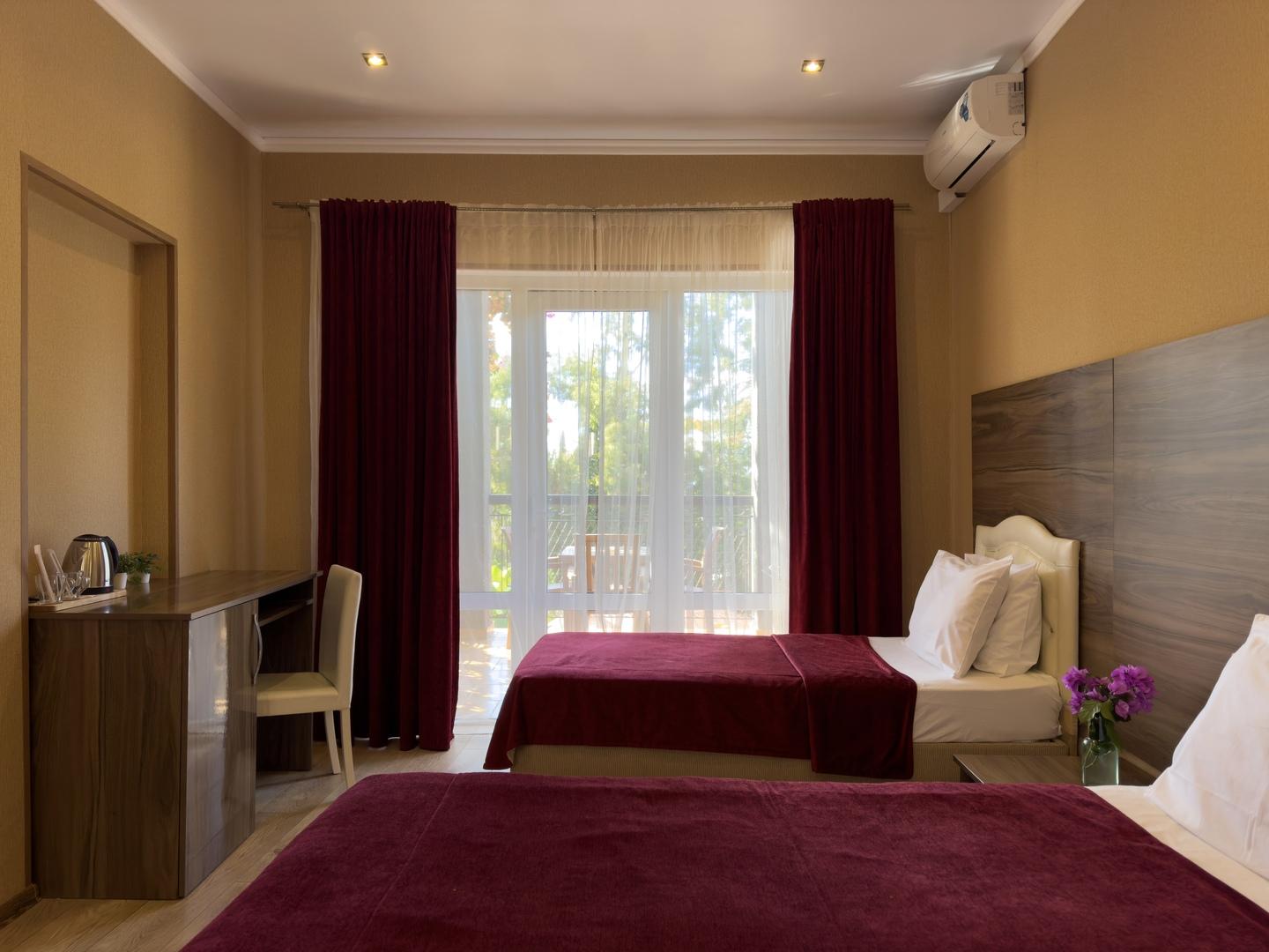 В номере: кровать двуспальная 160х200 см, односпальная кровать 90х200 см, прикроватные тумбы, открытый гардероб, зеркало, сейф, стол, стул, тв, кондиционер, холодильник, чайная станция, меблированный балкон, электрическая и напольная сушилки для белья, ванная комната: умывальник с зеркалом, унитаз, душевая кабина, косметика, фен, набор полотенец, в том числе для пляжа и бассейна в период высокого сезона. Халаты и тапочки в период высокого сезона. Доп место - диван-кровать или кресло-кровать для одного гостя. Максимальное размещение – 4 человека.