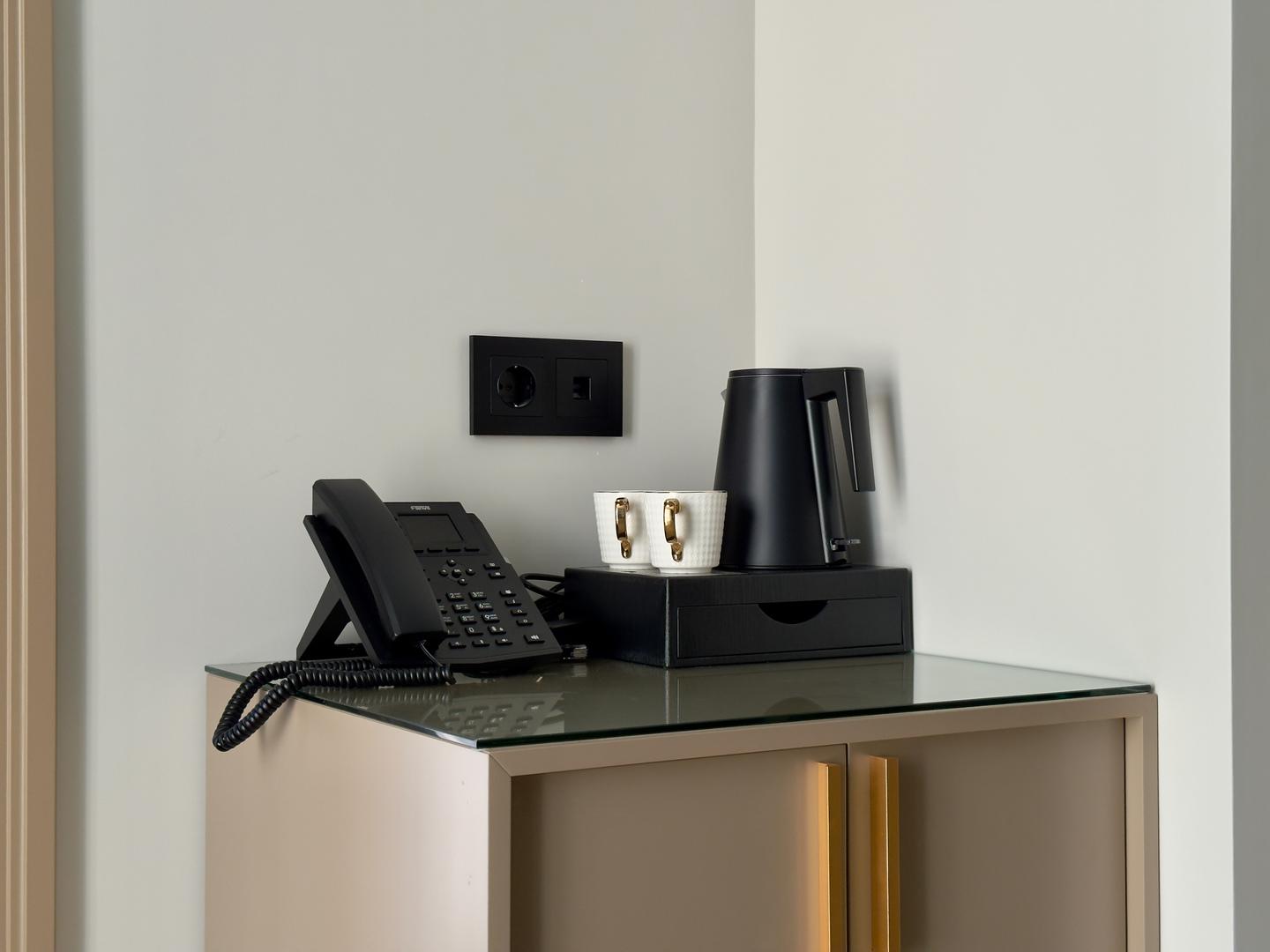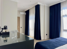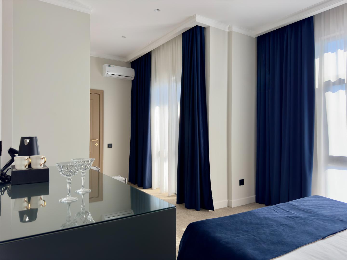 В комплектации каждого номера: собственный санузел с роскошной ванной, фен, полотенца, косметические принадлежности, балкон, чайная станция, индивидуальная сплит-система, мини-холодильник, телевизор и спутниковое ТВ.