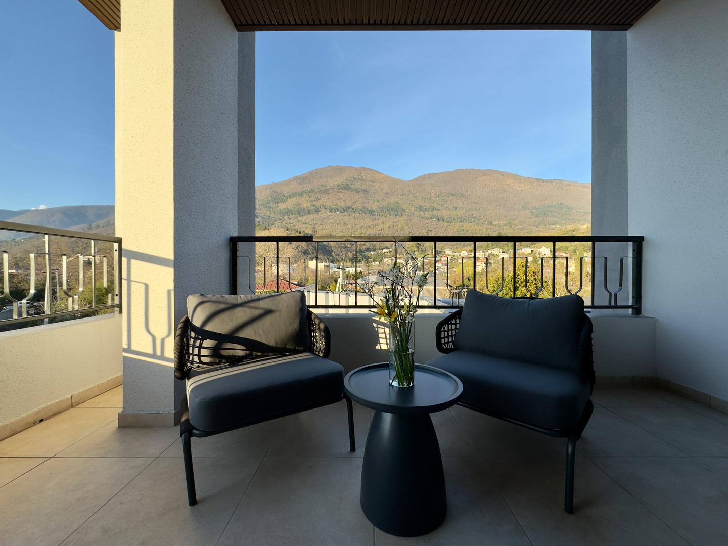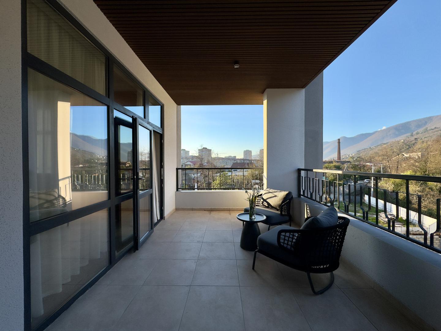 В номере изящная ванная комната выполненная в тропическом стиле, просторная гостиная с био-камином, а также спальня.К номеру прилагается большая мебелированная терраса с потрясающим видом на горы.