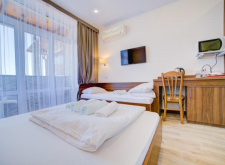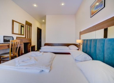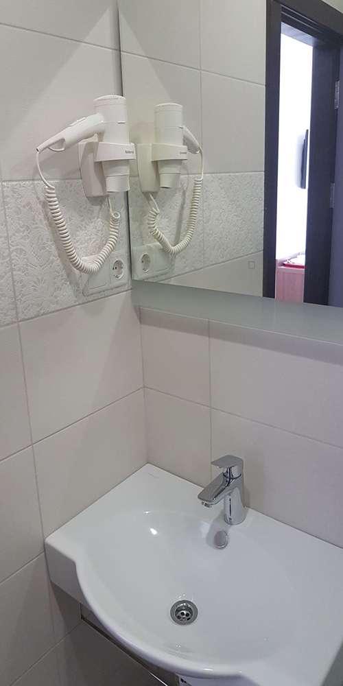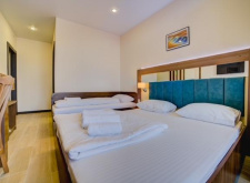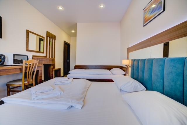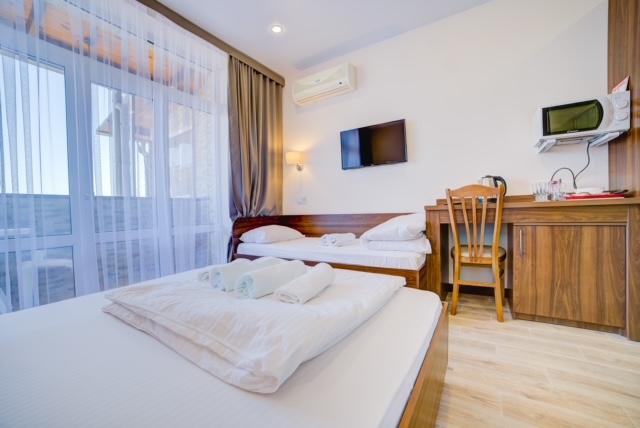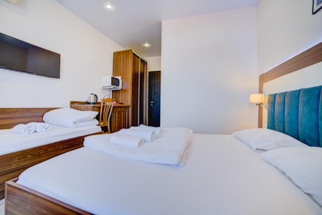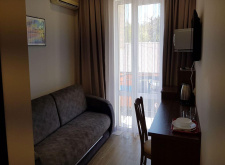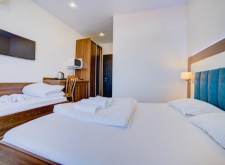 Площадь комнаты – 16 кв.м. К вашим услугам: двуспальная кровать, односпальная кровать с ортопедическими матрасами, кондиционер, телевизор, холодильник, микроволновая печь, чайник, набор посуды, сейф, тапочки. С/у с душевой кабинкой, фен, гигиенические наборы, мыло, гель, шампунь. На этаже расположена кухня общего пользования.